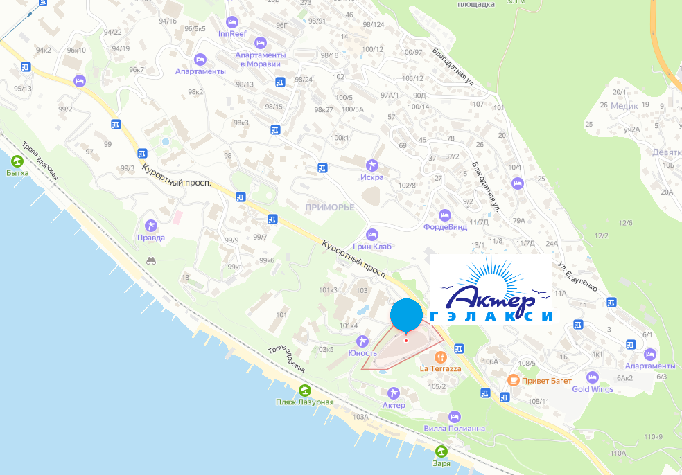 В состав АК Актер Гэлакси входит SPA и фитнес-центр, бассейны с морской водой, кафе и рестораны, детские и спортивные площадки, различные сервисные службы.