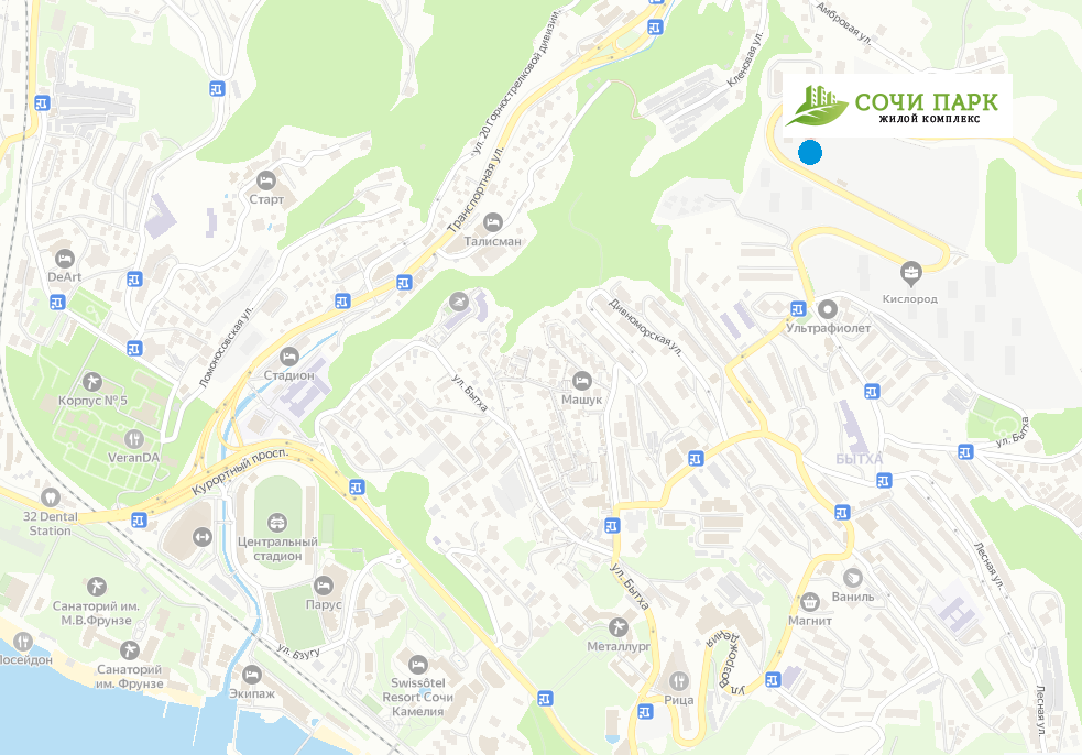 ЖК Сочи Парк является центром курорта: рядом транспортные развязки, цирк, парк «Дендрарий», Зимний театр и многое другое.