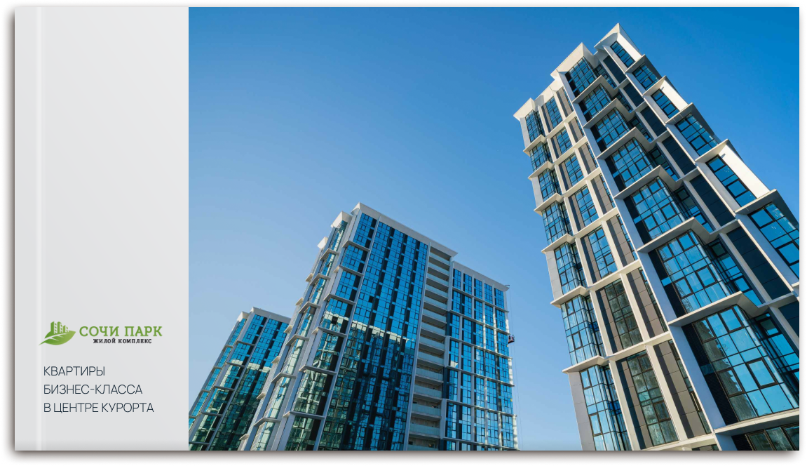 ЖК Сочи Парк состоит из 9 домов бизнес-класса с паркингами и коммерцией на первых этажах, а также отдельно стоящего пятиэтажного паркинга с торговым центром на верхнем этаже.